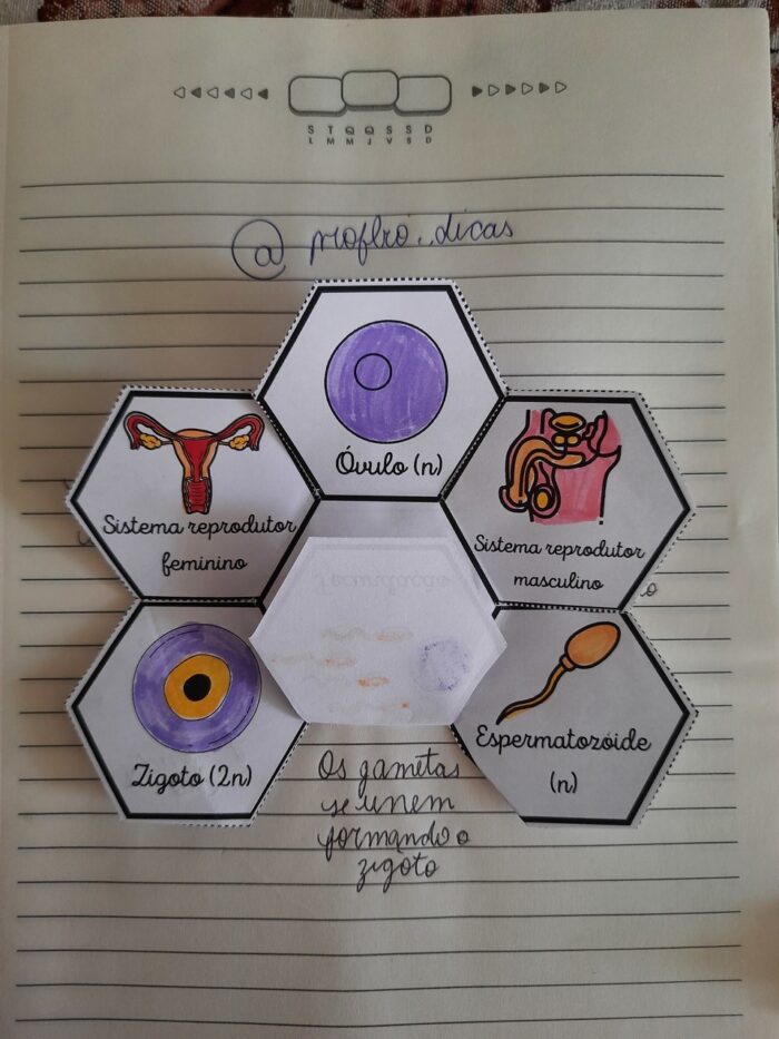 Molde preto e branco e colorido de 1 atividade de caderno interativo sobre reprodução humana.