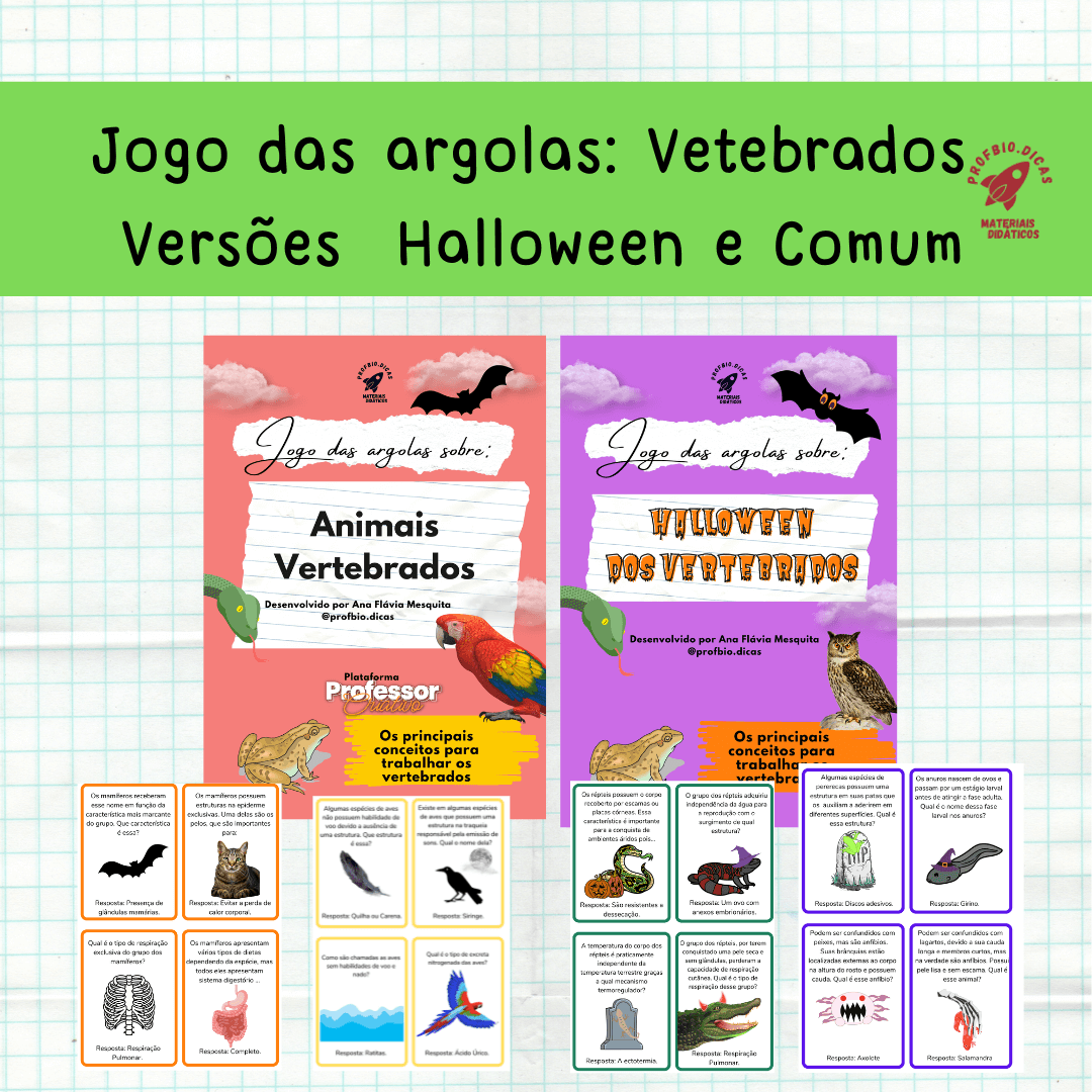 Material em PDF com 31 páginas temáticas de Halloween sobre os vertebrados. Todo o material acompanha decoração, gabarito, instruções para o professor e para os estudantes.